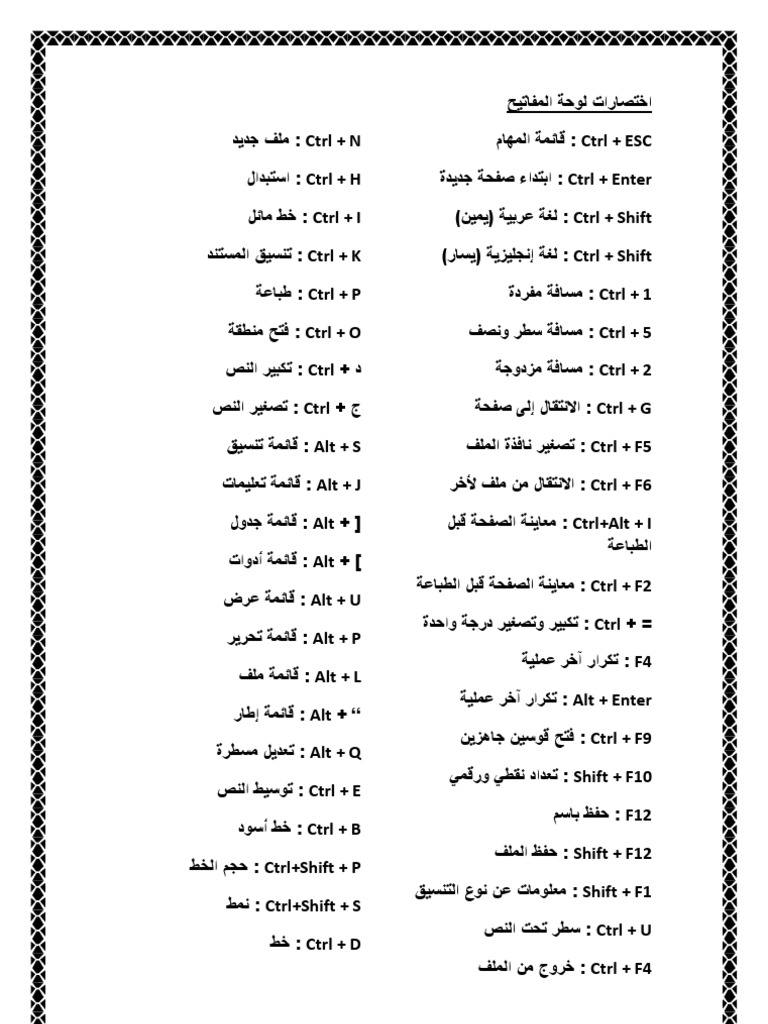 اختصارات لوحة المفاتيح فى الورد