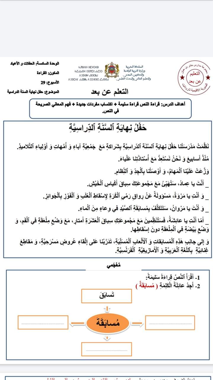 تقويم و دعم اللغة العربية الوحدة السادسة المستوى الثاني موقع الأساتذة والتلاميذ للتعليم عن بعد