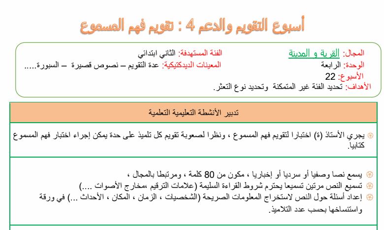 أسبوع التقويم و الدعم اللغة العربية المستوى الثاني ابتدائي الوحدة الرابعة موقع الأساتذة والتلاميذ للتعليم عن بعد